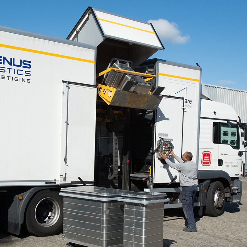 Medewerker van Rhenus Data laadt een afgesloten container in de Rhenus shredderwagen. De container gaat daarna open en de inhoud wordt direct vernietigd in de shredderwagen